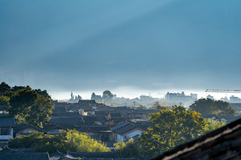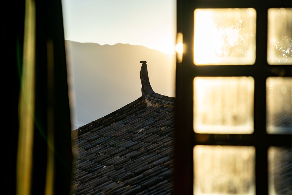 清晨7点醒来,天色尚未放亮,室外的温度接近零度。套上秋裤和薄羽绒服,洗漱完毕后,透过窗户望向东方,群山在天光的浸染下层层显现,近处的古镇隐没在晨雾中,朦胧而静谧。四周万籁俱寂,静得仿佛能听见时间流动。等待天色渐明,忽然间,太阳跃出山尖,刹那间金光万丈。昨夜银色月光覆盖的床榻,此刻像被撒满了碎金般耀眼。