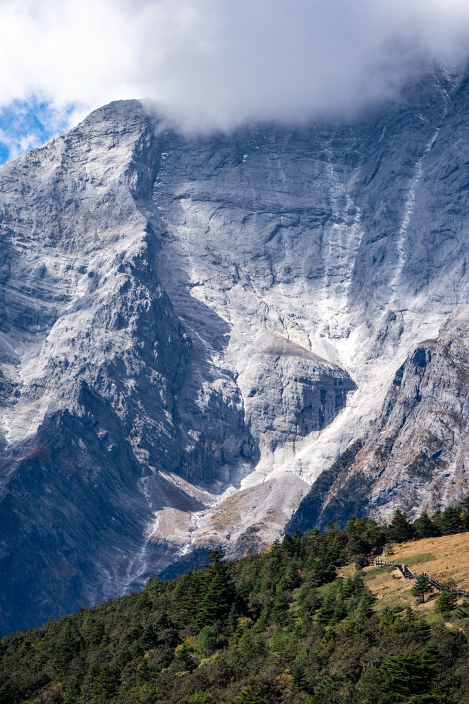 通往牦牛坪的车程约40分钟,沿着盘山公路一路蜿蜒前行,雪山时隐时现。路旁有不少村庄,恰逢周末,看到不少学生搭车返校。到达牦牛坪停车场后,换乘缆车继续上行。缆车缓缓上升约20分钟,途中远眺云雾缭绕的雪峰,皑皑白雪笼罩在神秘之中,令人不禁感叹古人对雪山仙境的想象竟如此贴近现实。随着缆车不断攀升,抵达3800米高的观景点,眼前的牦牛坪草甸豁然开朗,雪山仿佛一下子近在咫尺,如画卷般壮丽铺展。只是积雪主峰略偏离视线中心,但依旧震撼。