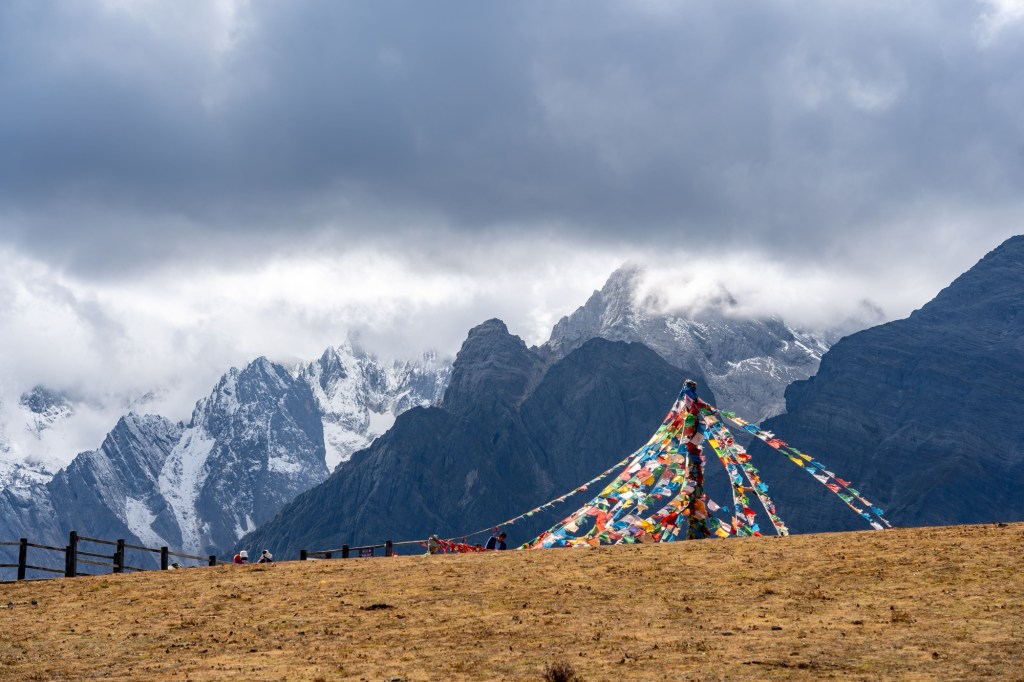 正午时分,在小卖部买了两串牦牛肉串,味道意外得好。随后绕着高原草甸缓步行走,气温虽只有几度,但强烈的阳光让人并不觉得寒冷。置身于这壮阔的雪山高原,抬头看白云在蓝天中缓缓飘动,光影在山间忽明忽暗,雪线与山脊清晰可见,完全是一帧无需滤镜的天然画作。一路上几乎没碰到其他游人,天地广阔,独自在雪山脚下漫步。途中,偶遇几只不怕人的黑山羊,它们似乎成了雪山派来的引路者,咩咩叫着,陪伴短暂前行。风中经幡猎猎作响,逐步靠近而又逐步远离雪山,直到回到缆车附近的雪花寺时,不觉已过去了三个小时。