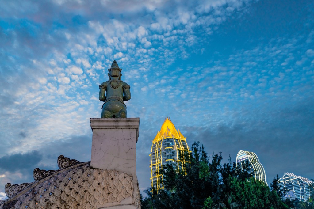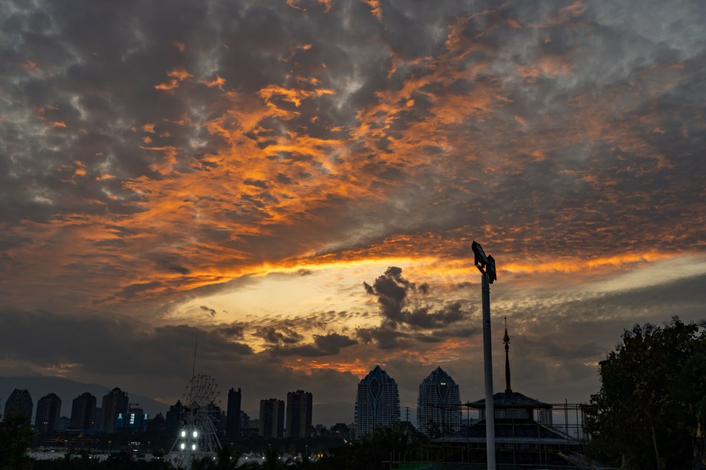 As I exited the stupa, I was greeted by a stunning view of the layered clouds overhead, resembling tiles spread out across the sky. Standing on the platform behind the temple, I gazed westward at the sky ignited by colorful clouds, with the sunset growing ever more vibrant, while the starlight night market below began to light up. This scene exceeded my expectations, making the incense money feel well spent.