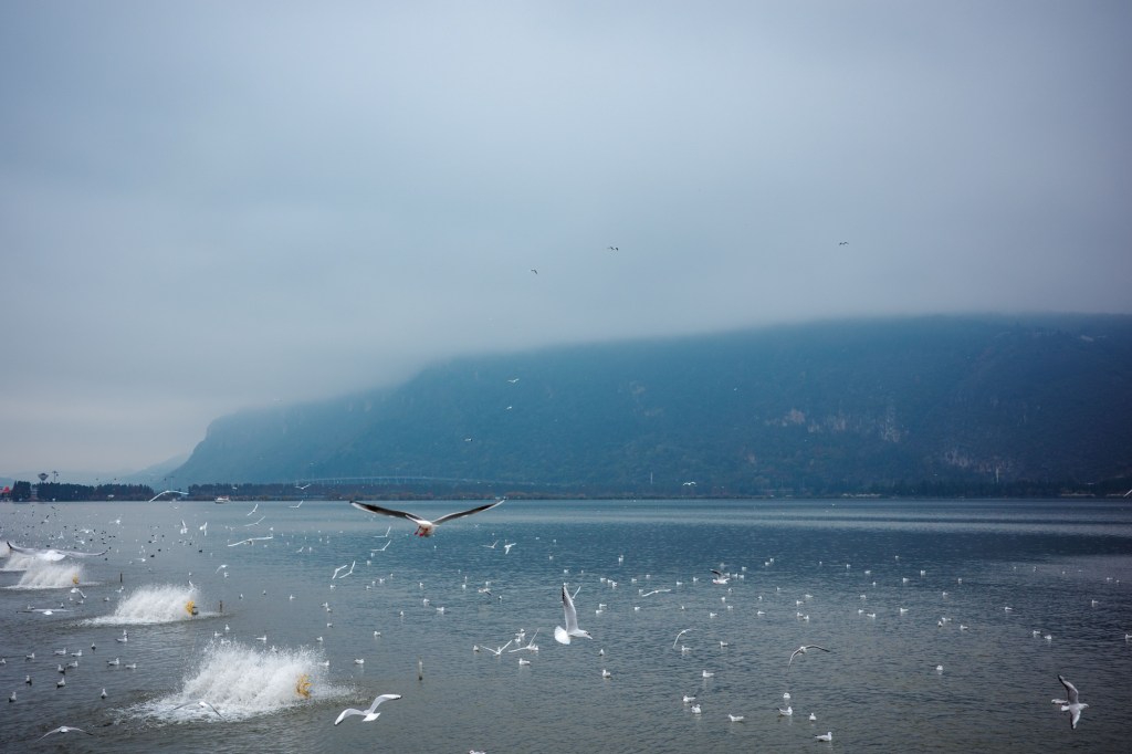 Walking to the southern, less crowded area, I gazed across the lake at the distant Xishan Mountain shrouded in thin mist, hazy and elusive. The seagulls quietly perched on the railing, seemingly enjoying a moment of leisure. I couldn’t help but think of the seagulls by the Erhai River in Dali, where they freely fished and soared in an undisturbed realm. Perhaps, their winter vacation is not something they wish to be overly disturbed by humans.
